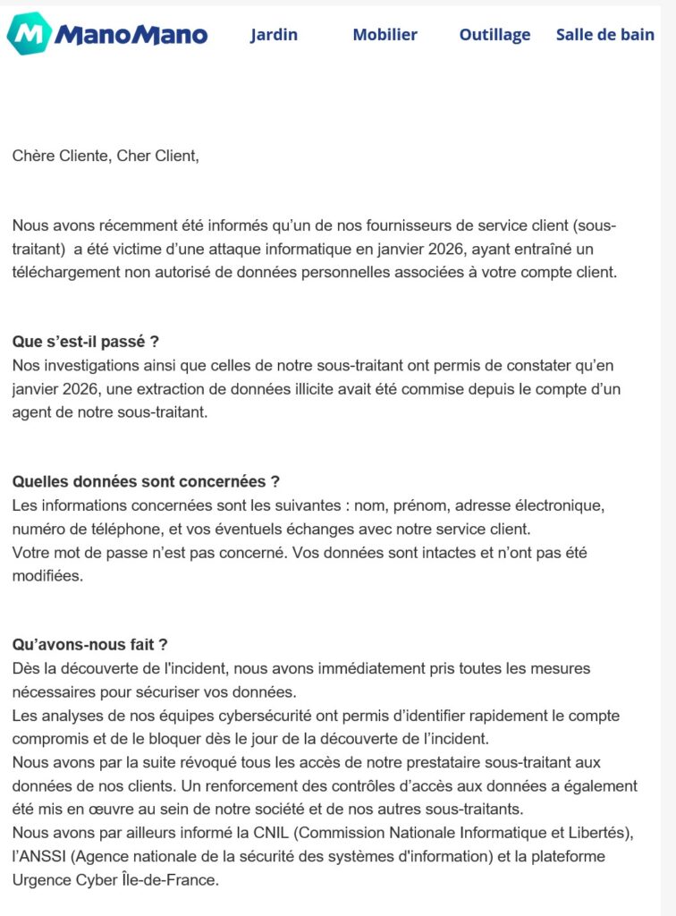 Cette fois ci c'est par un prestataire en charge du support client que ManoMano a subi une cyberattaque.