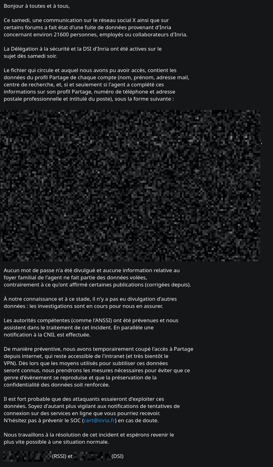 L'Inria (Institut national de recherche dédié au numérique, à l’informatique, à l’intelligence artificielle, à la cybersécurité et aux mathématiques appliquées) est concernée par une fuite de données portant sur 21 647 agents portant sur les données de Partage.