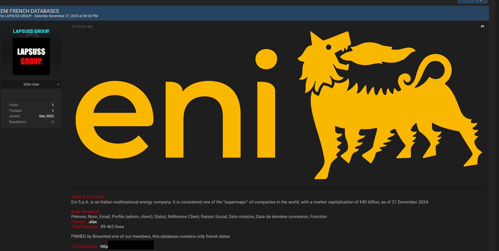 LAPSUS$ GROUP revendique une cyberattaque massive contre Eni France