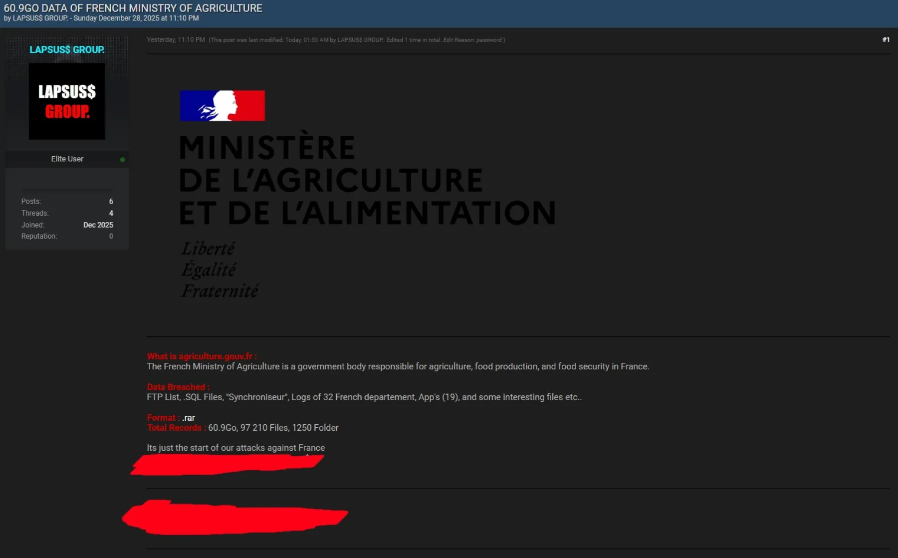 Le Ministère de l'Agriculture piraté par le groupe LAPSUS$ GROUP