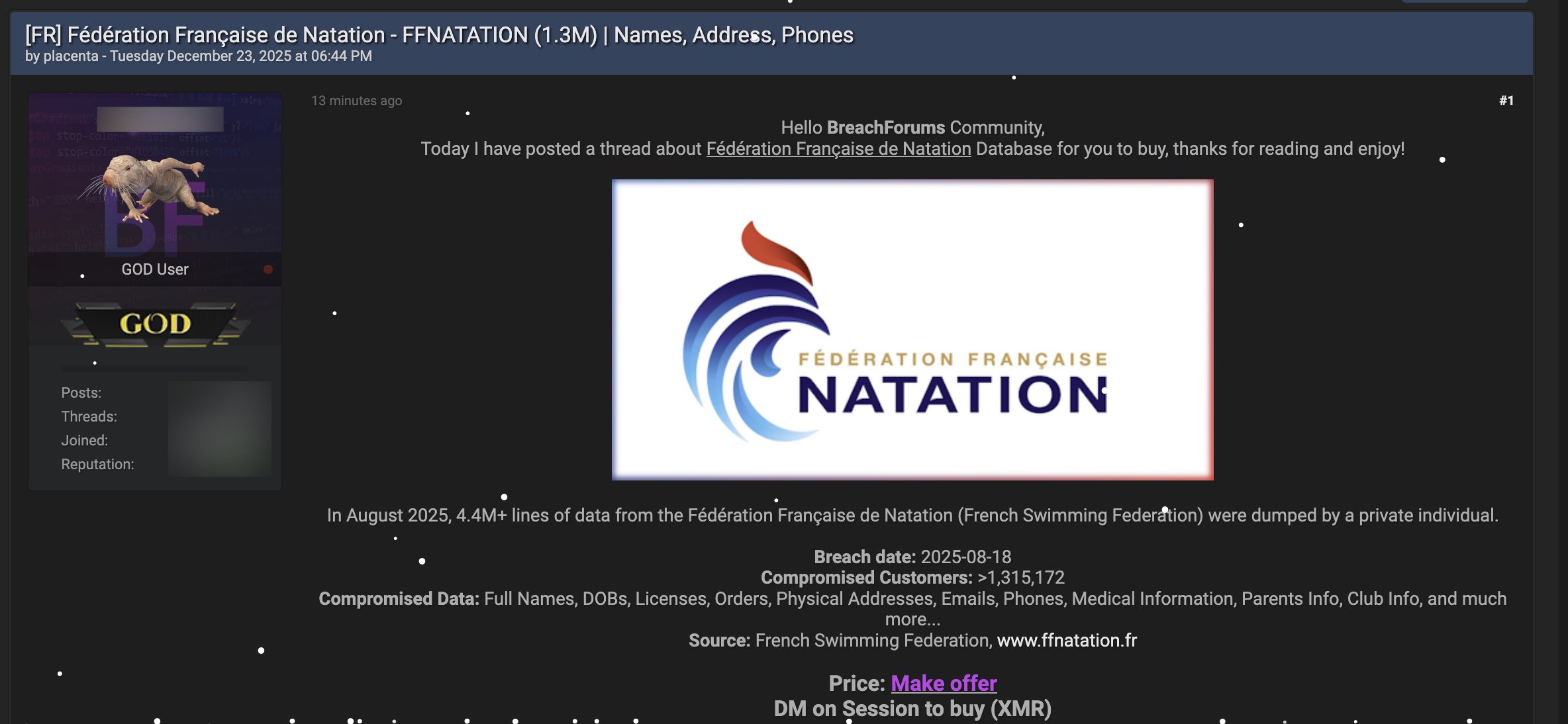 Extranat, la plateforme de gestion administrative de la Fédération Française de Natation (FFN) a fait l'objet d'une cyberattaque et d'un vol de données dans la nuit du 6 au 7 décembre 2025.
